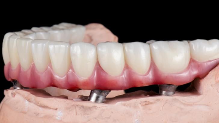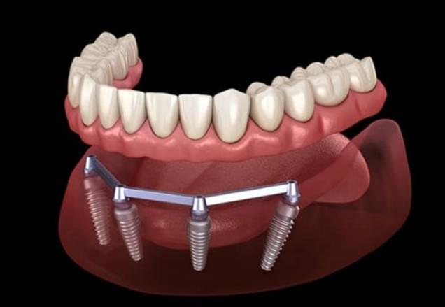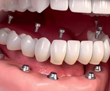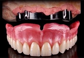 Rehabilitación fija atornillada sobre implantes, que combina estructura metálica con recubrimiento en resina o cerámica que simula dientes y encía. Muy indicada en pacientes sin dientes.